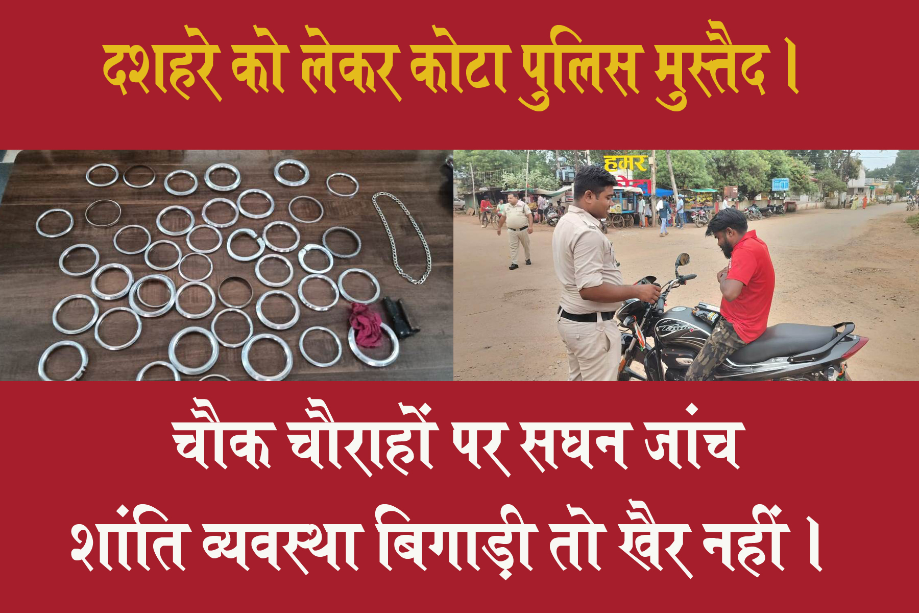 दशहरे में कोई अप्रिय घटना ना हो इसके लिए कोटा पुलिस थाना प्रभारी तोप सिंह नवरंग के नेतृत्व में मुस्तैदी से डटी हुई है । कल शाम कोटा पुलिस ने शहर के विभिन्न चौक चौराहों पर सघन जांच अभियान चलाते हुए असमाजिक तत्वों को चेतावनी दे डाली है कि यदि शांति व्यवस्था बिगाड़ने की कोशिश की तो उनकी खैर नहीं ।